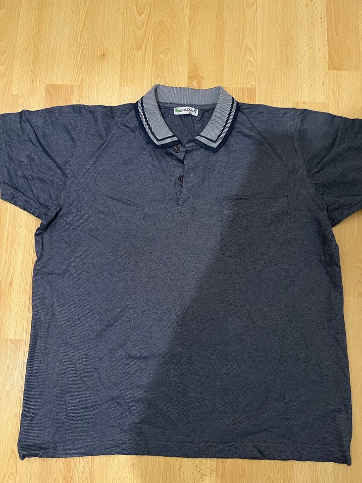 Gri denim kumaştan, düğmeli yakalı ve kısa kollu, rahat kesim erkek polo tişört. Günlük sokak stili için uygun, normal boyda.