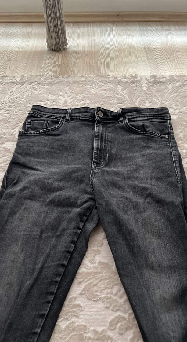 Gri renkte, rahat kesim, normal boy, tokalı detaylı denim kadın pantolon, günlük kullanıma uygun.