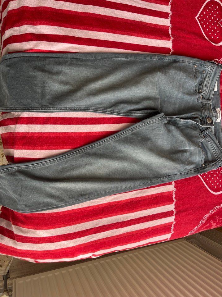 Gri denim kumaştan, regular fit ve normal boyda, kemerli erkek pantolon. Desensiz, günlük kullanıma uygun rahat bir tasarıma sahiptir.