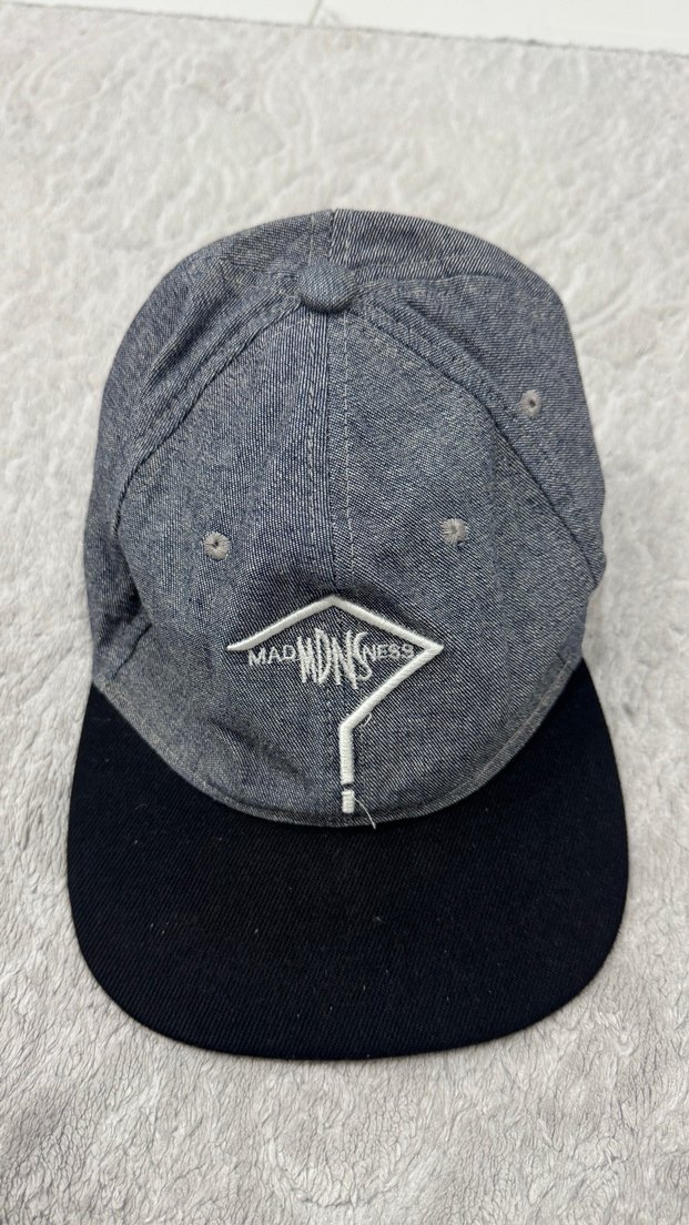 Gri denim şapka, siyah siperliği ve nakışlı 'Madness' logosuyla minimalist tasarımı ve rock punk havasıyla dikkat çekiyor.