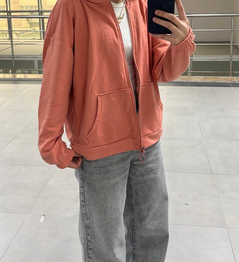Salaş kesim gri denim sweatshirt, uzun kollu ve yuvarlak yakalı. Günlük kullanıma uygun rahat ve şık bir parça.