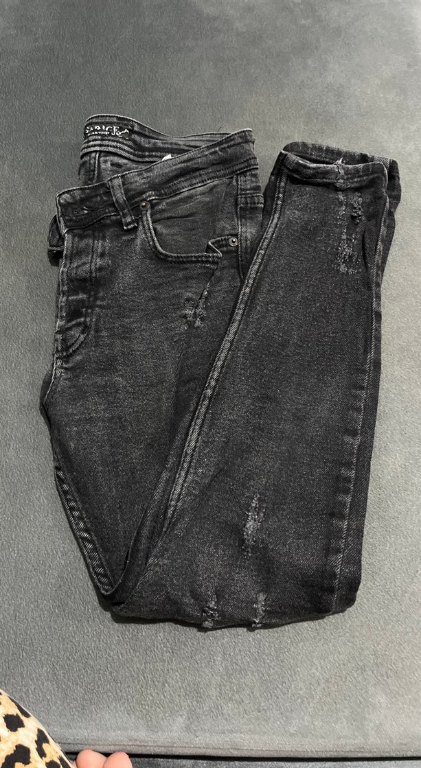 Dar kesim, tokalı gri denim jean. Normal midi boyunda, sokak stiline uygun, günlük kullanıma uygun.