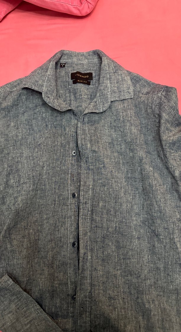 Gri denim kumaştan, düğmeli, yakalı ve uzun kollu erkek gömleği. Normal boyda ve rahat kesim, günlük sokak stiline uygun.
