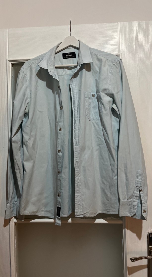 Gri denim kumaştan, uzun kollu, notlu yaka ve bol kesim erkek gömlek. Düğmeli ve cep detaylı, günlük rahat stil için uygun.