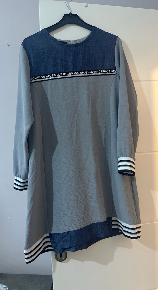 Uzun kollu, bisiklet yaka ve bol kesime sahip kadın tunik. Denim kumaştan yapılmış, gri tonlarda şeritli manşet ve etek ucu detaylarıyla günlük rahat şıklık sunar.