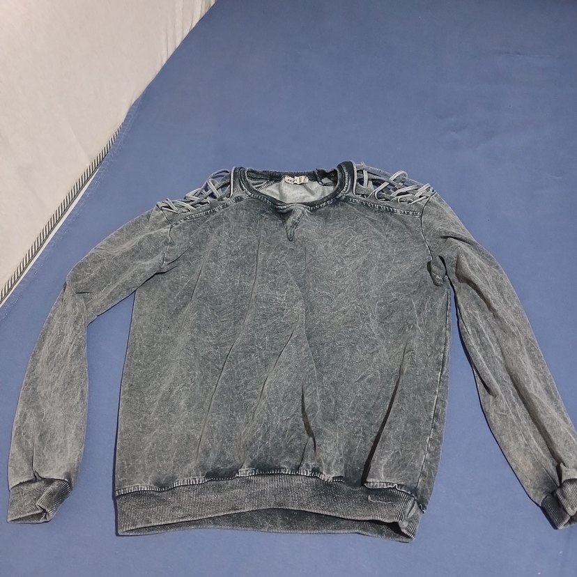 Gri renkte, düğmeli omuz detaylı, bol kesim uzun kollu denim sweatshirt. Günlük kullanıma uygun, rahat ve sokak stiline uygun.