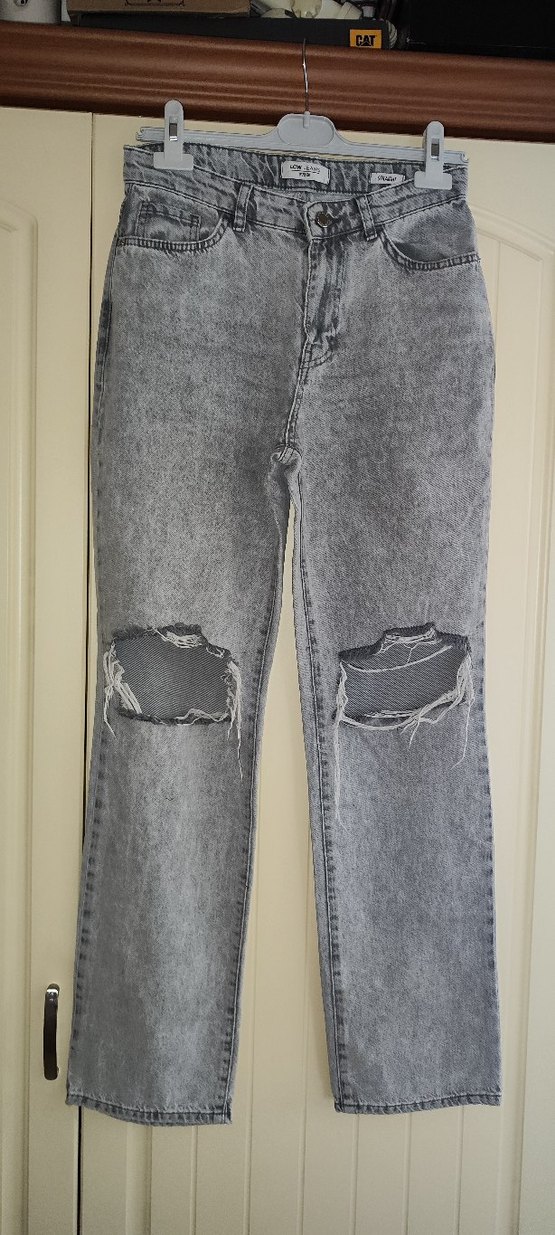 Gri denim kumaştan, dizlerinde yırtık detaylı, midi boy, salaş kesim kadın jean. Günlük rahat ve sokak stiline uygun.