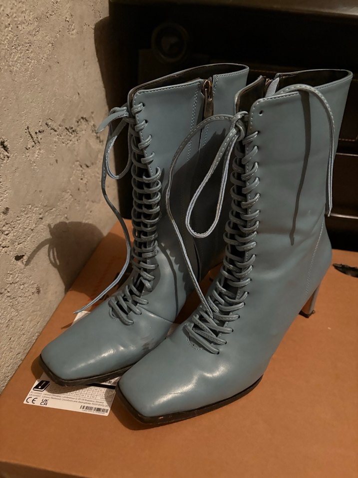 Gri deri, bağcıklı, stiletto topuklu kadın bot. Goth tarzına Parisian avant-garde dokunuşu ile günlük kullanım için şık ve dikkat çekici. Buckle detaylı.