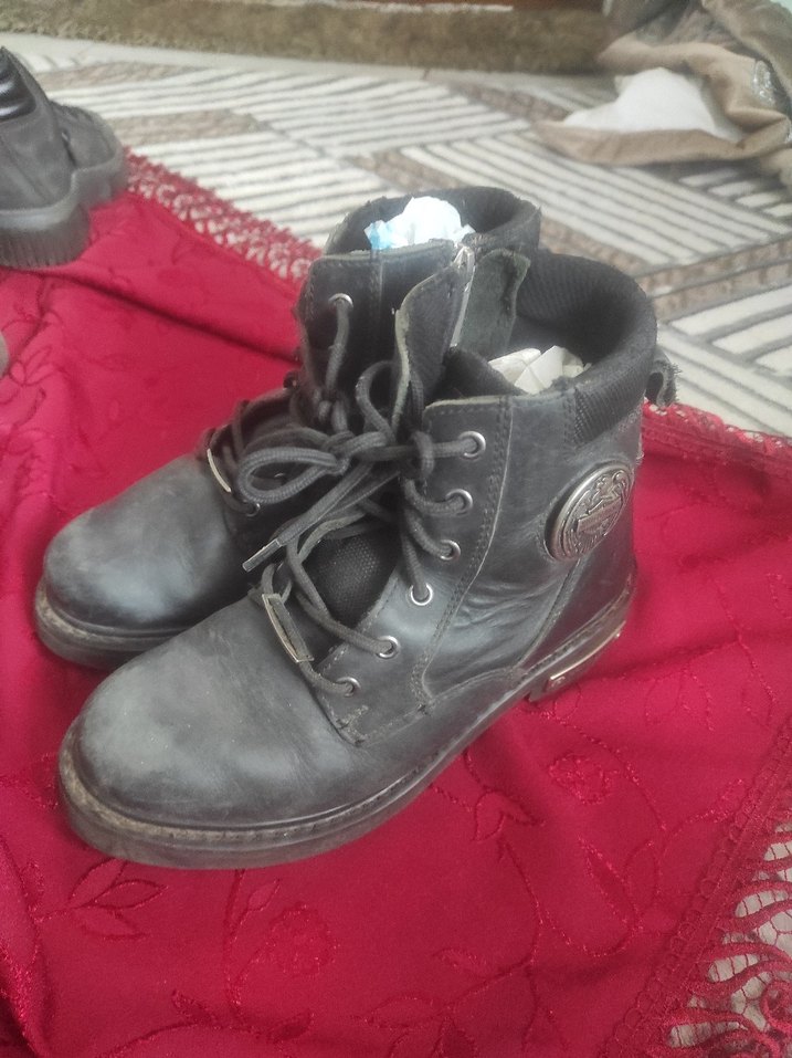 Gri deri biker botlar, bağcıklı ve tokalı detaylara sahip. Rock punk tarzını yansıtan, günlük kullanıma uygun sağlam tasarım.