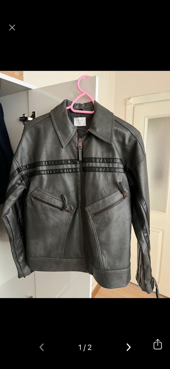 Fitted kesim gri deri biker ceket, kesik yaka ve bantlı kollara sahiptir. Kemer detayı ve fermuarlı cepleriyle trend grunge punk tarzına uygundur.
