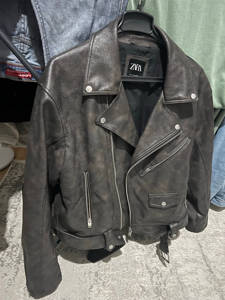 Gri deri biker ceket, bol kesim ve askılı kollarla. Çıtçıtlı yaka, tokalı detaylar ve fermuarlı cepler içerir. Rock punk havası sağlar ( ufak deforme var belli değil arkasında .
