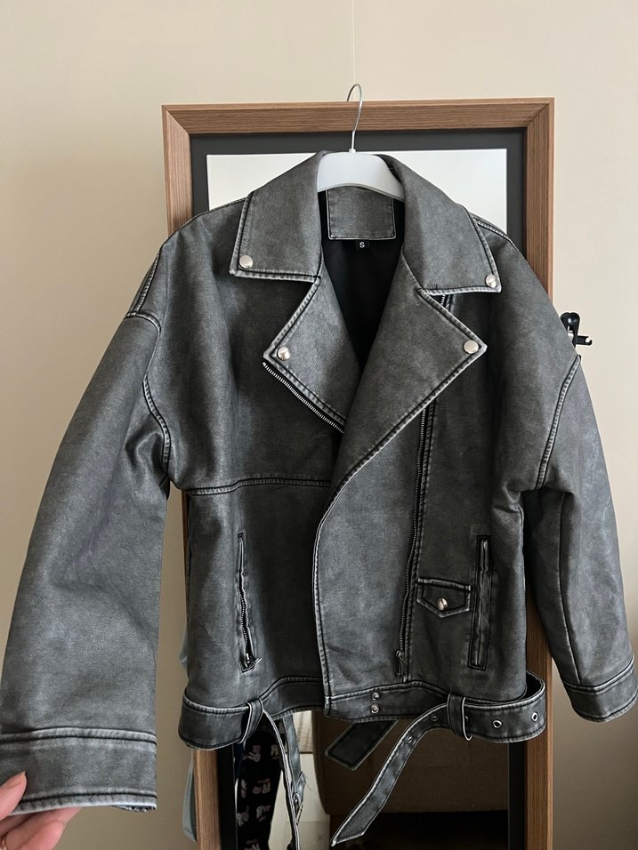 Gri deri biker ceket, kemerli ve kesik yakalı. Bol kesim ve askılı kollara sahip, trend casual tarz için uygun.
