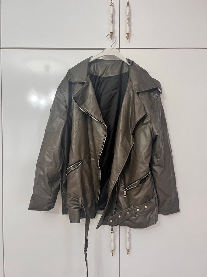 Gri deri biker ceket, kemerli ve salaş kesimlidir. Notlu yakası ve askılı kolları ile günlük sokak stiline uygundur. milla dan almıştım bir iki kere giydim yeniden farksız