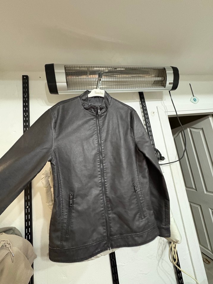 Gri deri biker ceket, yüksek yaka ve fermuarlı ön kısmıyla dikkat çeker. Uzun kollu, normal boy ve baskılı desene sahiptir.