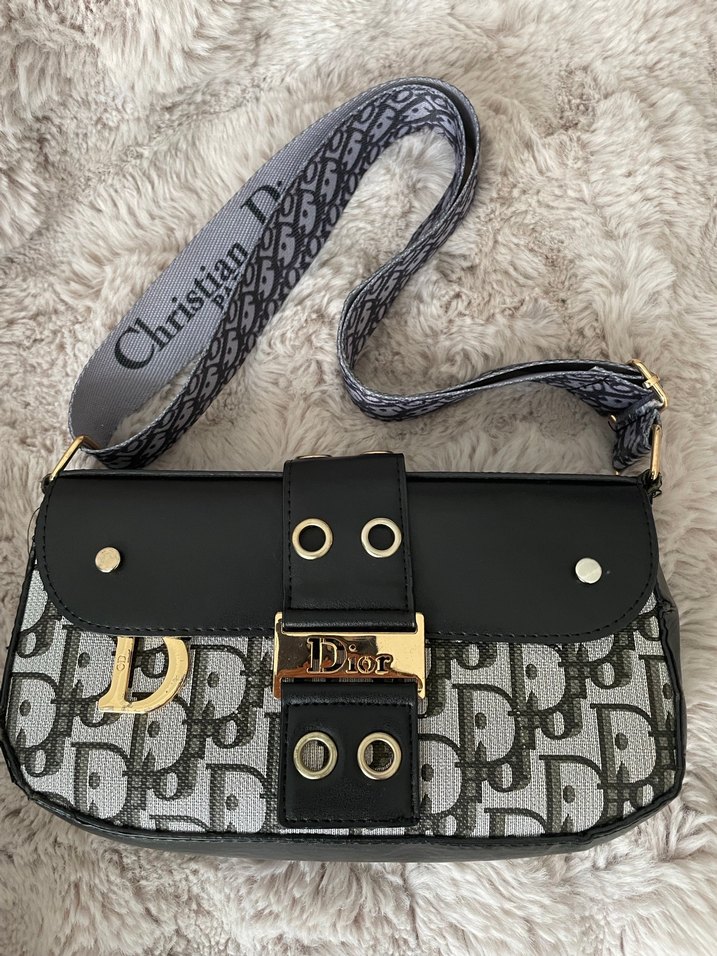 Gri deri Dior kadın çanta, baskılı desene ve altın detaylı buckled kapamaya sahiptir. Rahat kullanım için geniş, baskılı askısı bulunur.