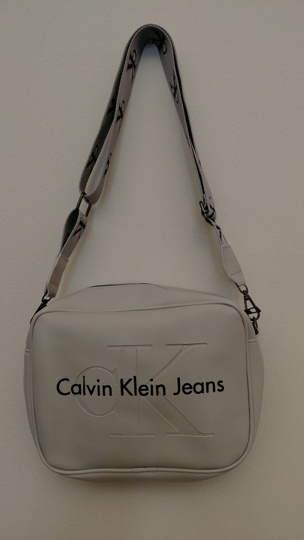 Gri deri omuz çantası, ayarlanabilir tokalı askı ve baskılı Calvin Klein Jeans logosu ile sokak stiline uygun.