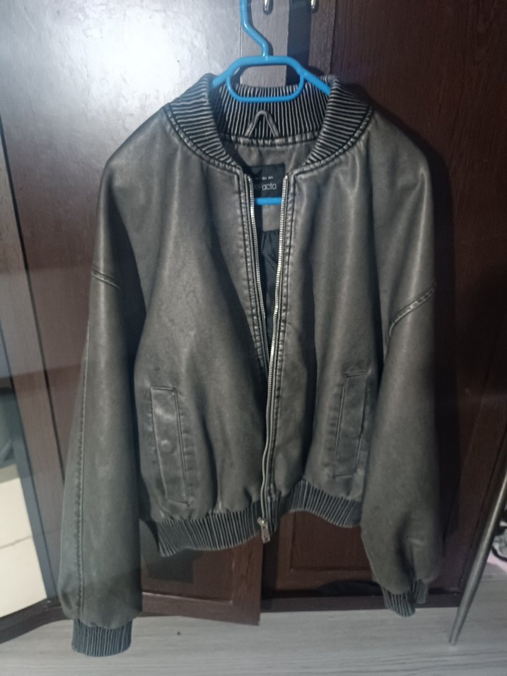 Gri deri ceket, rahat kesim ve fermuarlı. Notlu yaka ve uzun kollu, günlük kullanıma uygun.