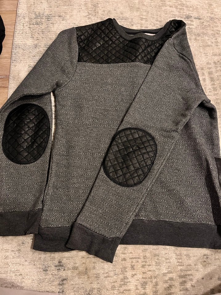 Gri renkte, omuz ve dirseklerde deri detaylı, uzun kollu ve dar kesim erkek sweatshirt. Rahat sokak stiline uygun. Derisinde görseldeki gibi hafif dökülme mevcuttur çok kez yıkandığı için fakat sapasağlam duruyor.