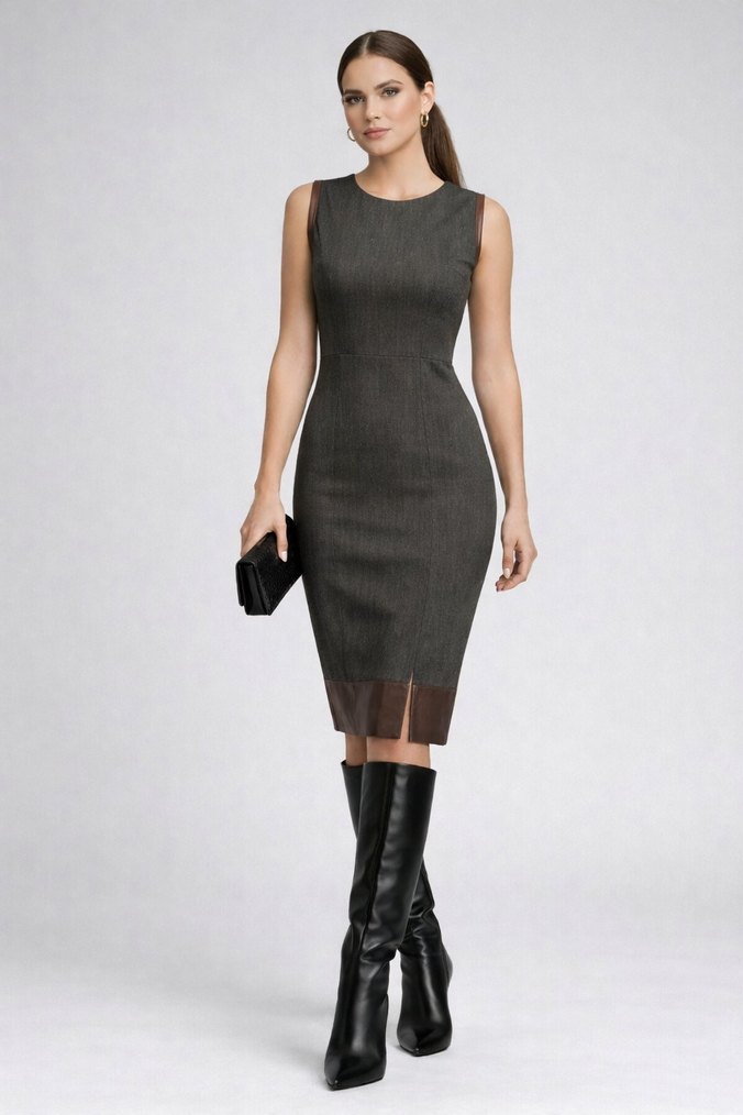 Gri deri detaylı kalem elbise, kolsuz ve V yakalı, kemerli ve midi boyda, ofis için uygun regular fit model.