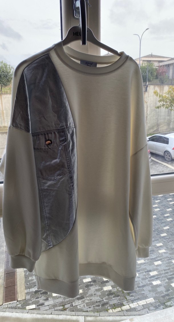 Gri, salaş kesim, bisiklet yaka ve uzun kollu sweatshirt, tek yan deri drapeli detaylıdır. Normal boyda, günlük sokak stiline uygun.