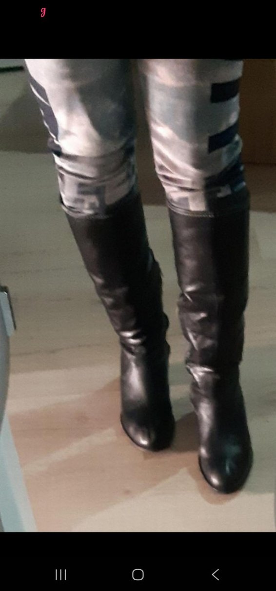 Gri deri dizüstü çizme, ince topuklu ve tokalı, gündelik sokak tarzına uygun gotik stil .Yurt dışından almıştım hiç bir kusuru yoktur. Topuktan baldıra 35 cm. topuk:5 cm bilek:28 cm baldır:36 cmdir