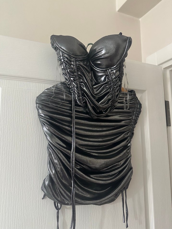 Siyah ve gri tonlarda, desenli drapeli deri göğüs korsesi. Straplez, askılı ve uzun kesimiyle parti için uygun, fit bir tasarım.