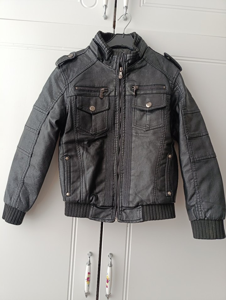 Gri deri erkek çocuk biker ceket, kemerli ve yaka detaylıdır. Çoklu cepleri ve fermuarlı kapanışı ile trend görünüme sahiptir.