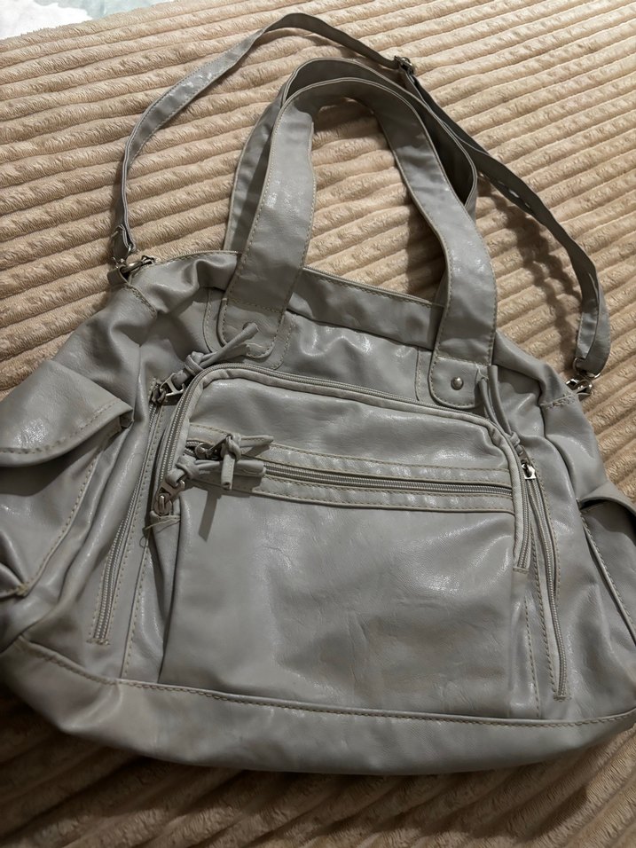 Gri deri kadın çanta, çoklu fermuarlı bölmeleri ve desensiz yüzeyiyle sokak stili ve günlük kullanım için uygundur.
