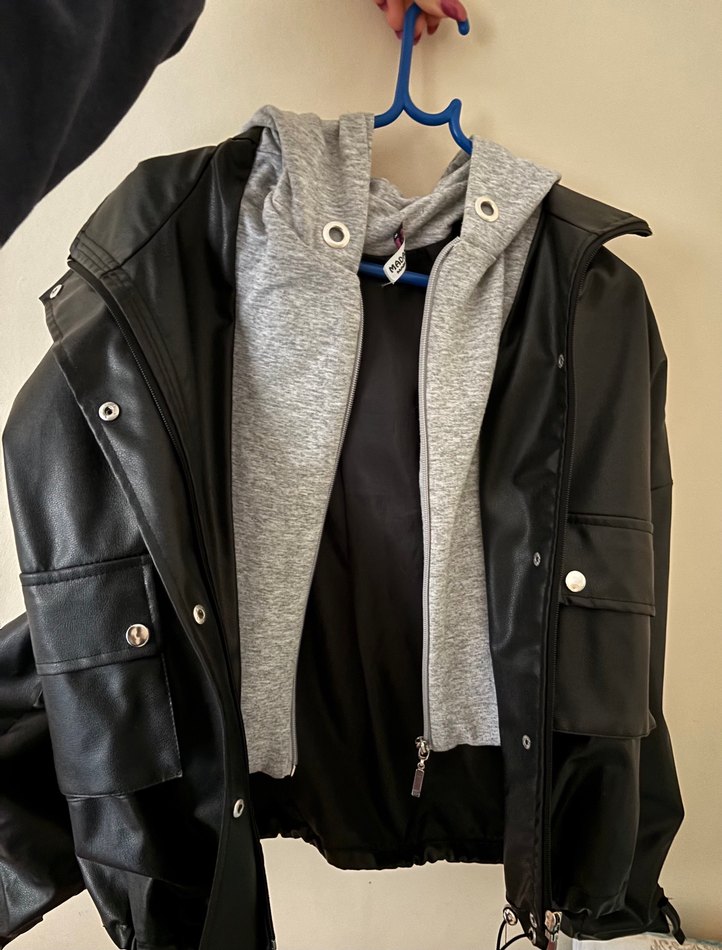 Gri deri, yüksek yakalı ve uzun kollu, fermuarlı, bol kesim kadın ceket. Sokak stili ve günlük kullanım için uygundur. Sadece bir kolunda kemer detayı koptu, fotoğrafta gösterilmiştir.