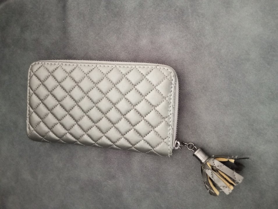 Gri deri malzemeden fermuarlı kadın cüzdan, kapitone desenli, klasik zarafeti modern tarzla birleştirir.