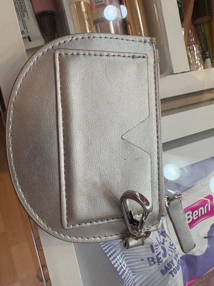 Gri deri kadın cüzdanı, fermuarlı kapama ve baskılı desen içerir. Önünde kartlık ve taşıma için klips bulunur. Üzerinde 'Ben' yazısı vardır.