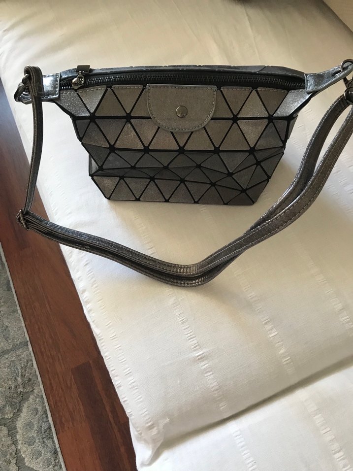 Gri deri kadın çanta, geometrik desenli ve tokalı kapaklıdır. Sokak tarzı ve çağdaş stilin birleşimi, günlük kullanıma uygundur.