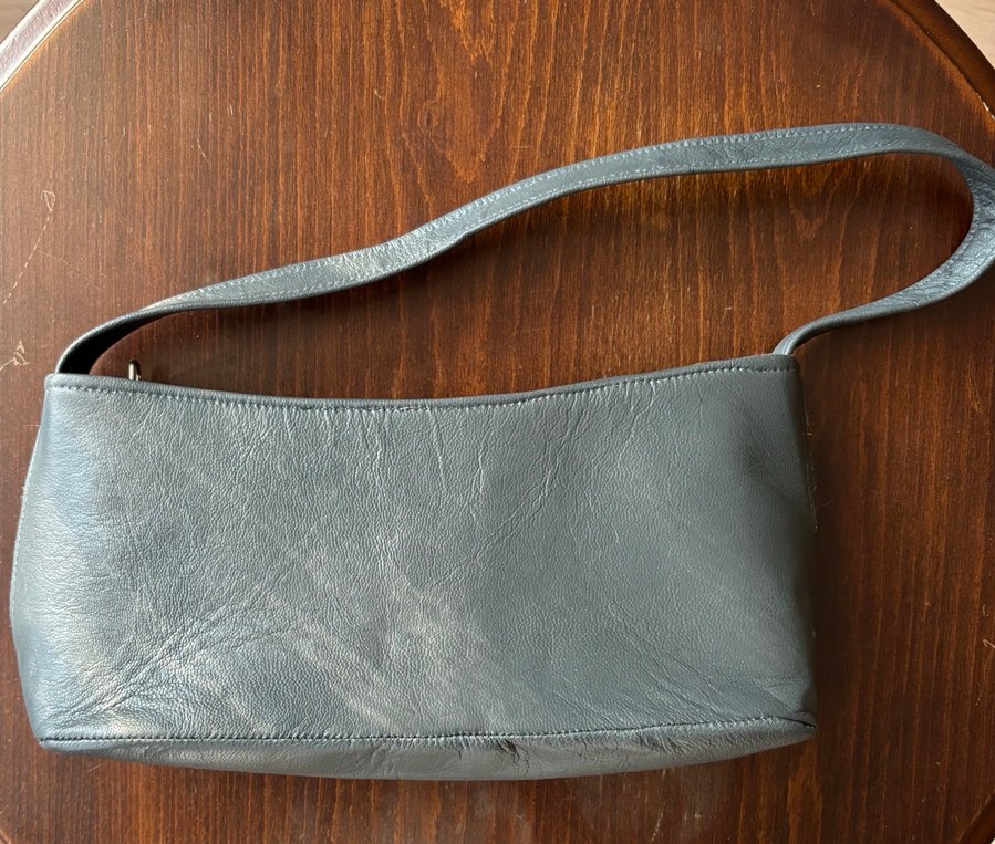 Bu gri deri kadın çantası, tokalı askıya ve günlük kullanıma uygun minimalist, desensiz tasarıma sahiptir. Gerçek deridir, özel yaptırıldı. Yan taraflarında birleşim yerlerinde hafif açılmalar mevcut.