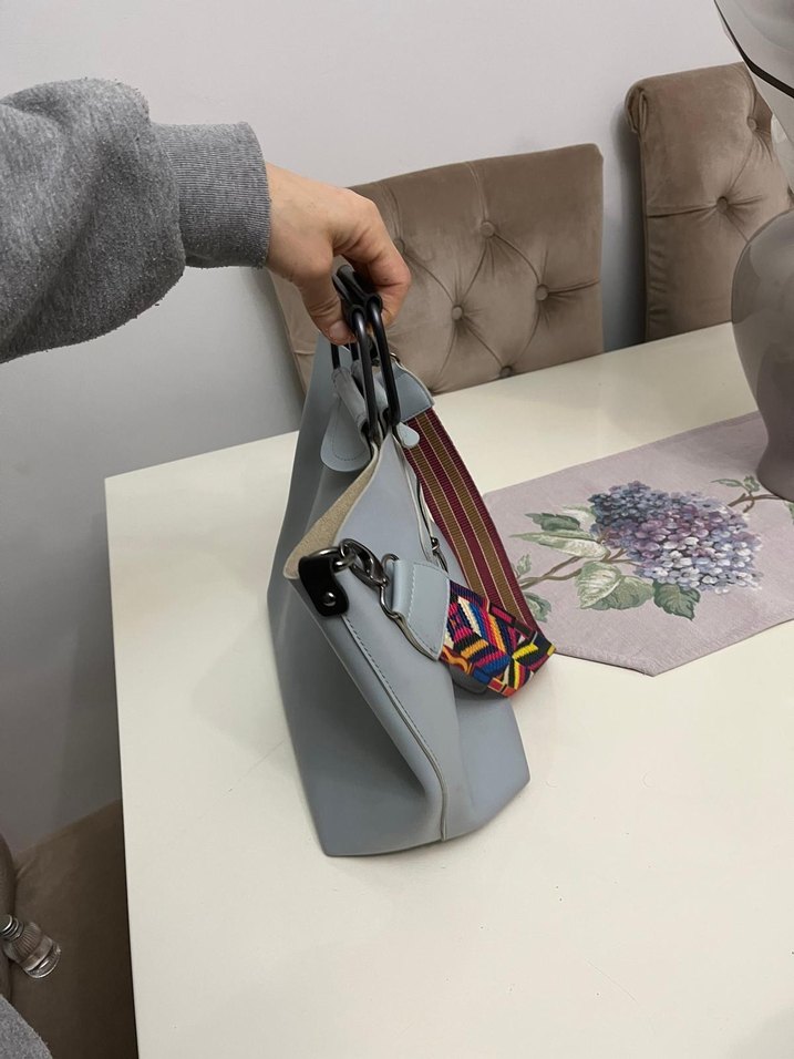 Gri deri kadın çanta, baskılı desen ve fermuarlı kapanışa sahiptir. Renkli desenli askısı ile minimalist ve avangart tarzı bir araya getirir.
