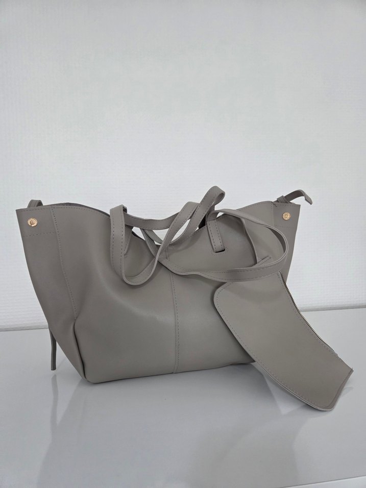 Gri deri kadın çanta, minimal tasarım ve kemerli detay ile. Günlük kullanıma uygun, çağdaş ve trend casual tarzda. cüzdanı yanında gelmektedir. içi süettir.