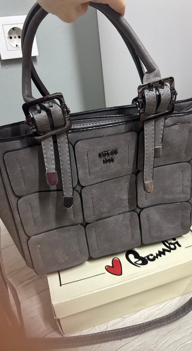 Gri deri kadın çanta, tokalı askılar ve baskılı desene sahip, trend sokak stili için uygun.