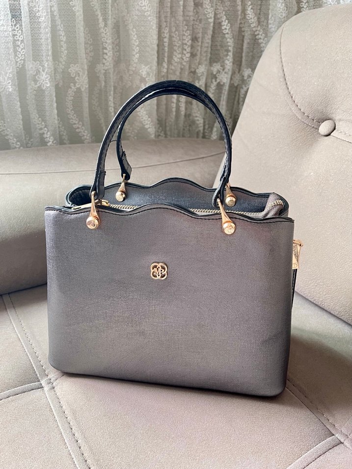 Gri deri kadın çanta, modern klasik tasarım, tokalı saplar ve hafif desenli. Günlük kullanıma uygun.
