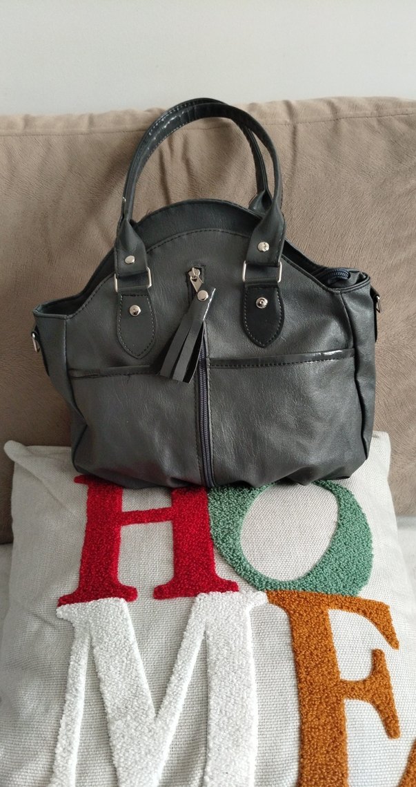 Gri deri kadın çanta, püsküllü detaylara sahip. Bohem tarzda, günlük kullanıma ve trend görünüme uygun.