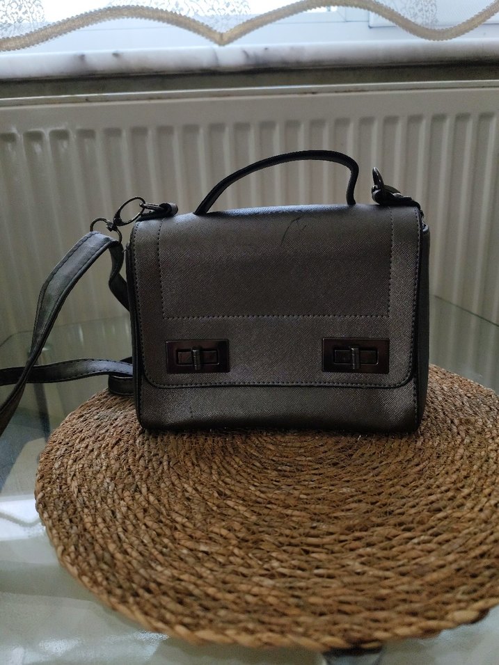 Gri deri kadın çanta, tokalı detayları, üst tutma sapı ve ayarlanabilir omuz askısıyla trend sokak stillerine uygun. ustunde cızık var baska sorunu yok kullanıma engel deıl az kullanıldı