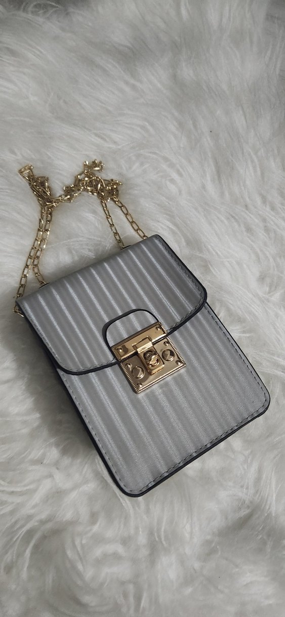 Gri deri kadın çanta, tokalı kapama ve yılan deseniyle. Altın renk zincir askılı, modern klasik Paris tarzı.