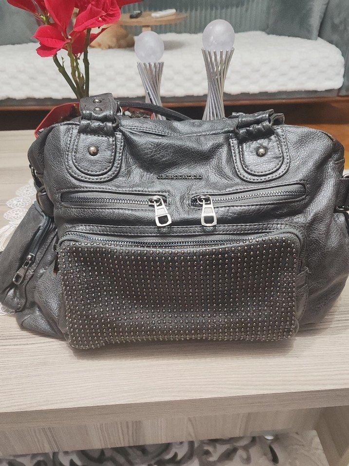 Gri deri kadın çanta, tokalı detaylar ve perçinli ön ceple sokak stili ve rock punk tarzını yansıtıyor.