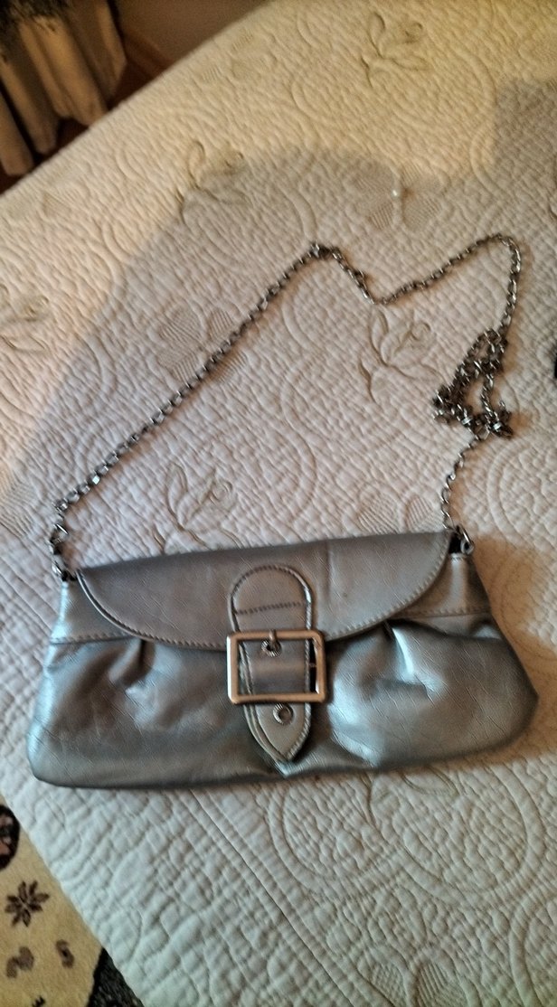 Gri deri kadının çantası, metal tokalı kapak ve zincir askı ile klasik zarafeti bohem stil ile birleştirir.