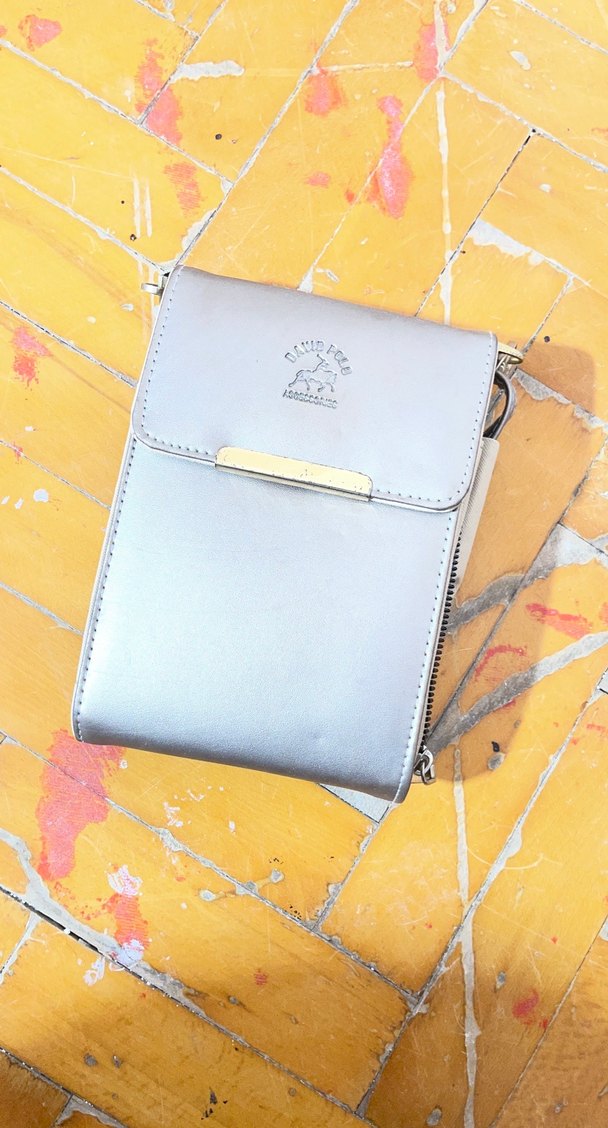 Gri deri kadın çapraz çanta, fermuarlı ve baskılı logo detaylıdır. Sokak modasına uygun, günlük kullanıma ideal, Paris tarzı şıklık sunar.