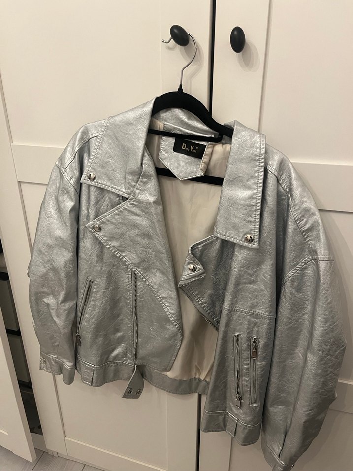 Gri deri kadın ceket, bol kesim, kesik yaka ve tokalı detaylarla günlük kullanıma uygun tarz sunar.