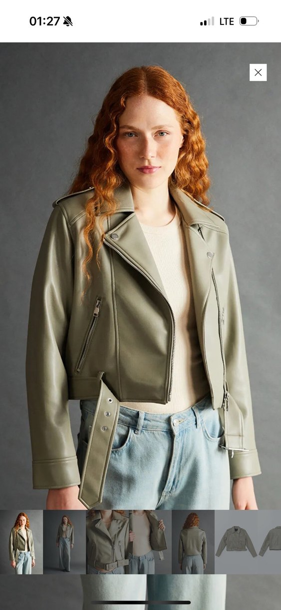 Gri deri, oturtmalı kesim ceket, yakalı, tokalı ve kayış detaylı kollara sahip. Midi boyda, sokak stiline uygun.