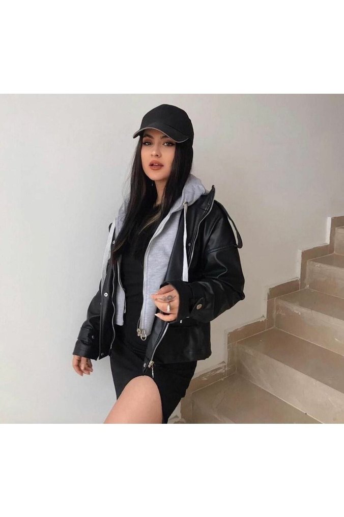 Gri Deri Kadın Ceket, Kemerli, Rahat Kesim