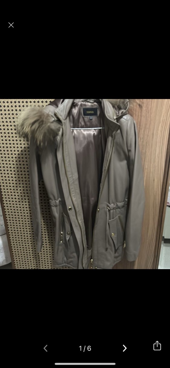 Gri deri ceket, kapüşonunda kürk detaylarıyla dikkat çeker. Uzun kollu, normal uzunlukta, dar kesim ve notched yaka tasarıma sahiptir. Midi boy kürklü arkadan yırtmaç detaylı halini deri tanca marka