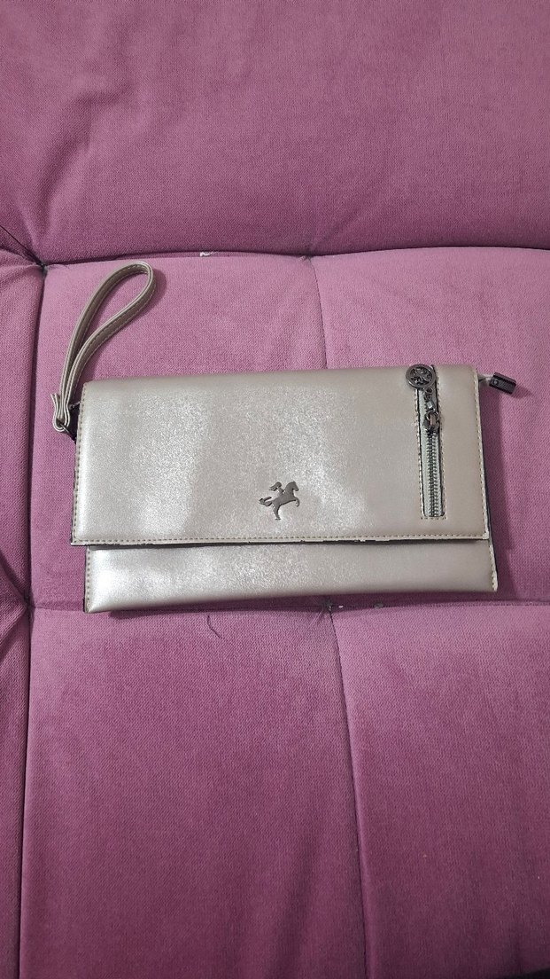 Gri deri kadın clutch çanta, fermuarlı cep ve baskılı detaylara sahip. Trendy sokak stiline uygun, bilek kayışı bulunur.