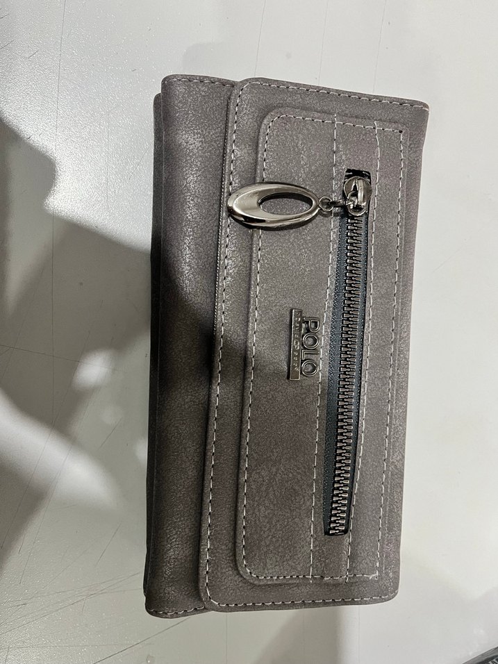 Gri deri kadın cüzdanı, fermuarlı cep ve minimalist tasarıma sahiptir. Günlük kullanım ve trend sokak stili için uygundur.