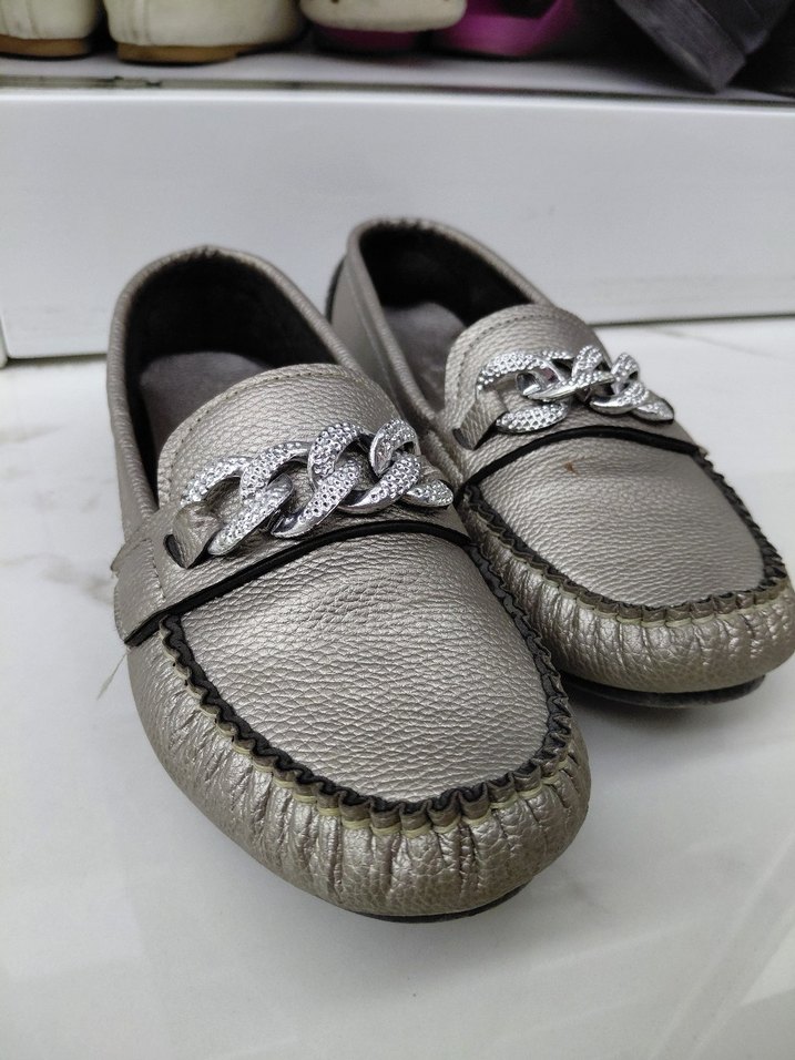 Gri deri, dolgu topuklu ve tokalı zincir detaylı, minimal desenli kadın babetler günlük kullanım için uygundur.